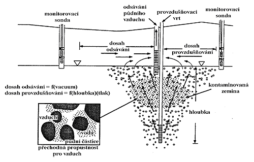 Dekontaminace zemin od těkavých ropných látek. Těkavé látky jsou vzduchem vynášeny na povrch a na aktivním uhlí odfiltrovány.